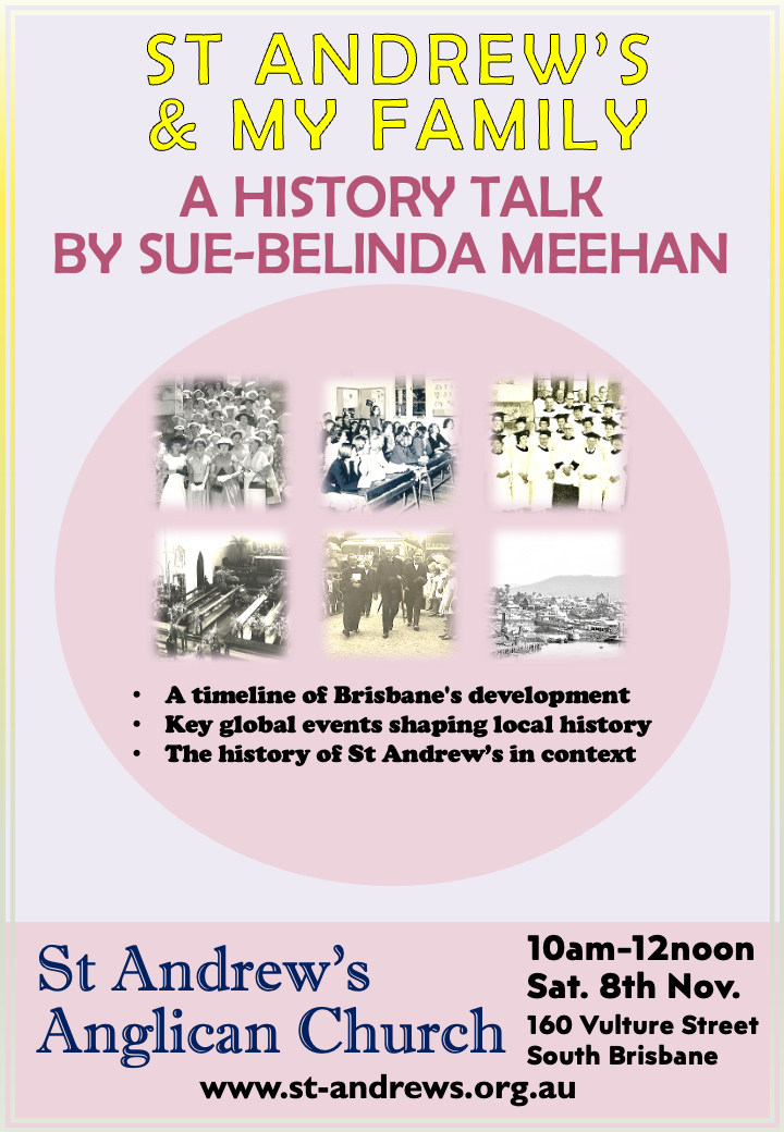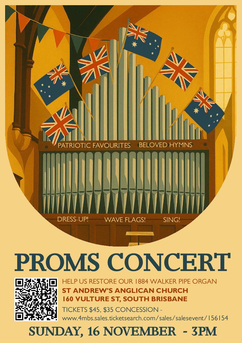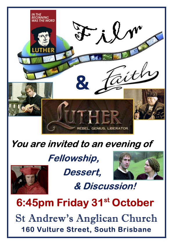 Events Film & Faith - Luther: Rebel, Genius, Liberator Friday, 31st of October, 6:45pm You are invited to an evening of:FellowshipDessert& Discussion! St Andrew's & My Family - A History Talk by Sue-Belinda Meehan Saturday, 8th of November, 10am-12noon A Timeline of Brisbane’s developmentKey global events shaping local history The history of St Andrew’s in context Proms Concert - Help Us Restore our 1884 Walker Pipe Organ Sunday, 16th of November, 3pm Tickets: $45, $35 concessionBuy tickets: https://4mbs.sales.ticketsearch.com/sales/salesevent/156154