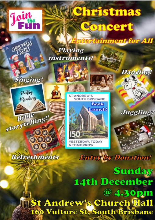 Events Christmas Concert - Join us for an afternoon of fun! Sunday, 14th of December, 4:30pm Bible storytelling, playing instruments, singing, dancing and more!Entry by donationChurch Hall