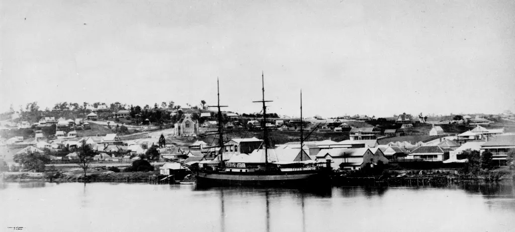 c. 1881. View of South Brisbane across the Brisbane River. The Anglican Church at South Brisbane is under construction. Photo source: State Libary of Queensland. Public domain.